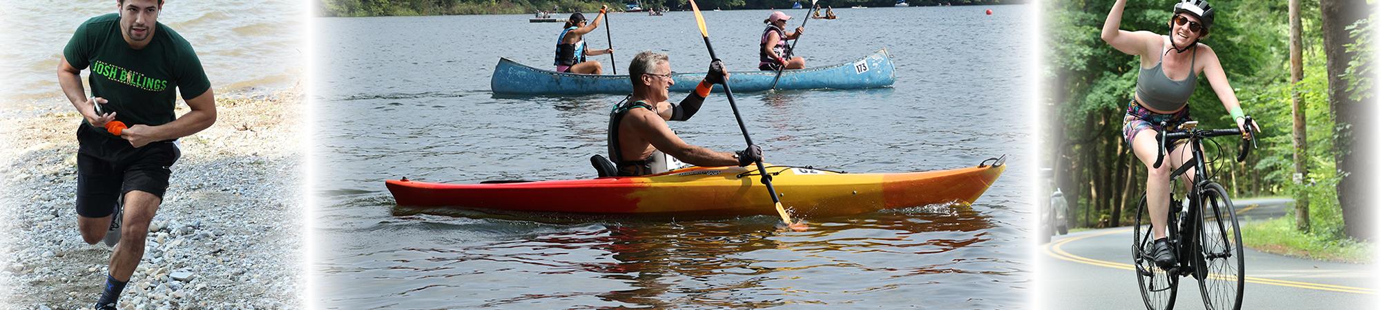 The triathlon begins with the bike leg departing from the Price Chopper parking lot in Great Barrington at 9:30 a.m. The paddle leg follows at the Stockbridge Bowl boat ramp and the race wraps up with the running leg around Stockbridge Bowl before finishing at Camp Mah-Kee-Nac.